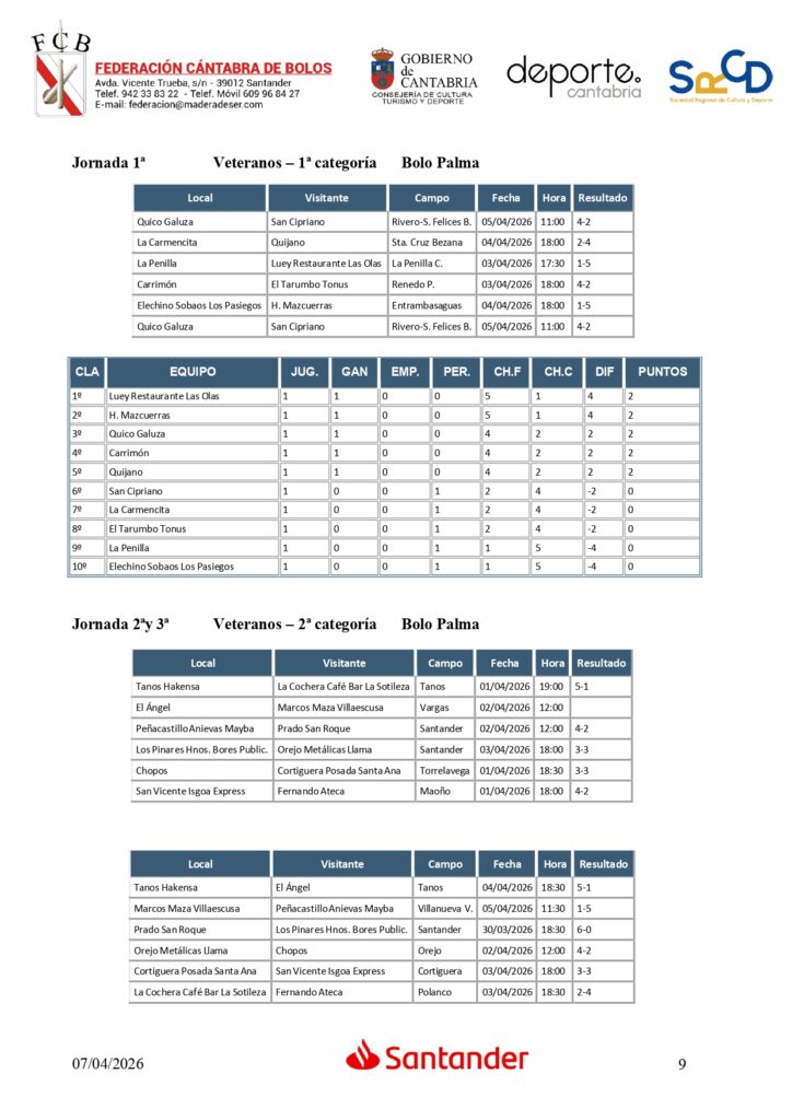 La Primera categoría de veteranos jugó la primera jornada con triunfos de Luey Restaurante Las Olas, H. Mazcuerras, Quico Galuza, Carrimón y Quijano. En la Segunda categoría se jugaron las jornadas 2 y 3 tras las cuales Tanos Hakensa logró su tercera victoria consecutiva, con un punto más que Peñacastillo Anievas Mayba.