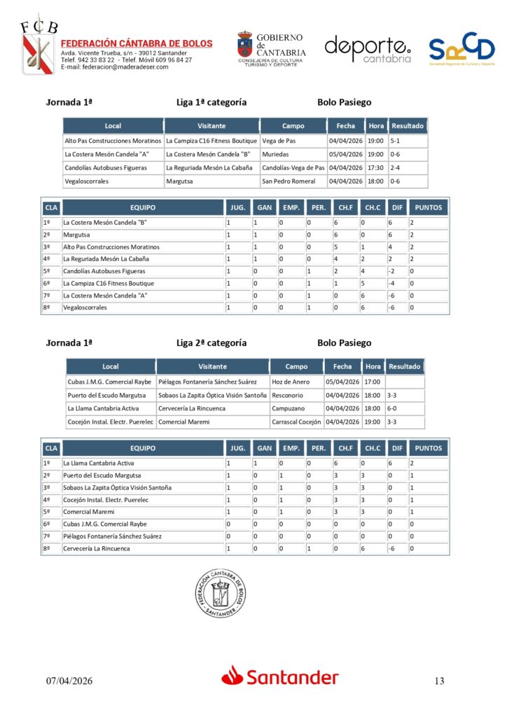 Comenzaron las dos categorías de bolo pasiego con los triunfos de La Costera Mesón Candela B, Margutsa, Alto Pas Construcciones Moratinos, La Reguriada Mesón La Cabaña, en Primera; y La Llama Cantabria Activa, en Segunda.