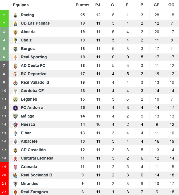 El Racing sumó ante la Real Sociedad B su tercer triunfo consecutivo en LaLiga Hypermotion (1-0) y los verdiblancos son ahora más líderes de la tabla con 25 puntos en su casillero. La escuadra cántabra superó a los donostiarras en los Campos de Sport, que celebraron con un tifo de La Gradona la noche de Halloween, con un gol de Canales mediado el primer acto y un gran trabajo defensivo. Y es que los racinguistas se mostraron muy sólidos, dejaron la puerta a cero y lograron su octava victoria del curso 2025/26. La nave camina hacia buen puerto, pero hay que seguir y la próxima cita será ante un recién descendido de Primera, la Unión Deportiva Las Palmas, en el estadio Gran Canaria (domingo 9-14:00 horas).