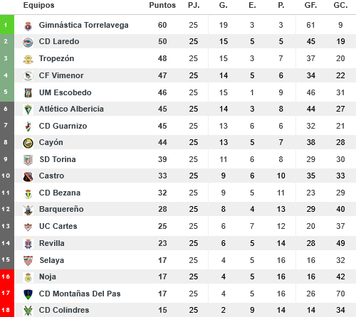 Con este resultado, los torrelaveguenses continúan líderes de la categoría con un total de 60 puntos. En segunda posición se sitúa el CD Laredo, al que la Gimnástica aventaja en 11 puntos. En este encuentro, Miguel Gándara vio su quinta tarjeta amarilla de la temporada, por lo que se perderá el próximo compromiso frente al UC