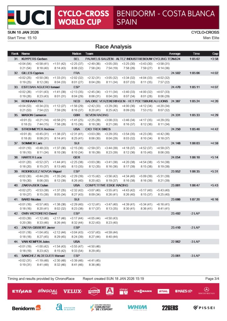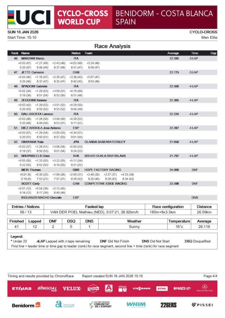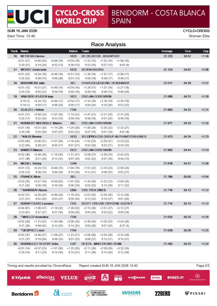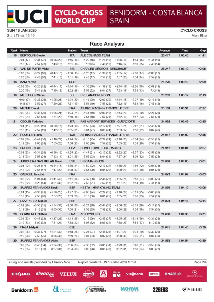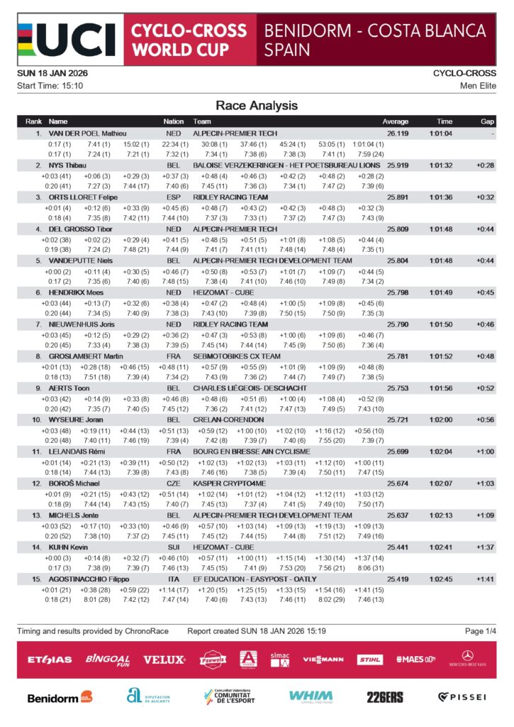 Tras esperar a Orts varias veces, Nys finalmente se distanció de él. El campeón del mundo, Van der Poel, celebró la victoria con una ventaja de 28 segundos. Nys terminó segundo, Orts tercero, con la gran explosión de júbilo en Benidorm.