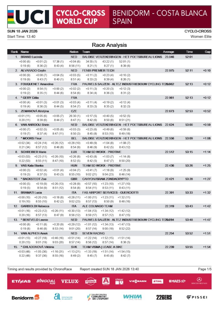En la prueba Élite Femenina, Lucinda Brand campeonó en la Copa del Mundo de Ciclocross UCI tras imponerse en Benidorm con una auténtica exhibición de sus cualidades más definitorias. La neerlandesa encontró en las primeras cuatro vueltas la resistencia de sus compatriotas Ceylin del Carmen Alvarado y Shirin van Anrooij, de las francesas Amandine Fouquenet y Célia Gery, de la húngara Blanka Vas y de la checa Kristýna Zemanová. En la quinta y antepenúltima fue cuando Brand lanzó un demarraje que, con su estilo diésel, afianzó hasta meta pese a la insistente caza de Alvarado y Fouquenet, segunda y tercera en meta.