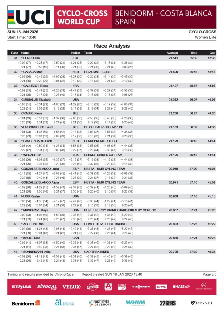 En la manga Juvenil Femenina, Benidorm presenció la revelación de una nueva estrella cuyo apellido es de sobra conocido en el mundo del ciclismo. Giorgia Pellizotti, hija de Franco ‘il Delfino di Bibione’ que fuera profesional más de una década, consiguió su primera victoria en una prueba de Copa del Mundo de Ciclocross UCI imponiéndose en un duelo mano a mano a la campeona del mundo francesa, Lise Revol, que con su segundo puesto certificó su triunfo en la general del torneo. Completó el podio la checa Barbora Bukovská, campeona de Europa de la categoría.
