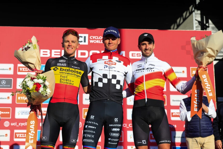 Mathieu van der Poel consiguió su sexta victoria de la temporada en la Copa del Mundo en Benidorm. El campeón del mundo lanzó un impresionante ataque en solitario al final de la primera vuelta. Thibau Nys y el ciclista local Felipe Orts se unieron a Van der Poel en el podio, tras rodar juntos en persecución de Van der Poel.