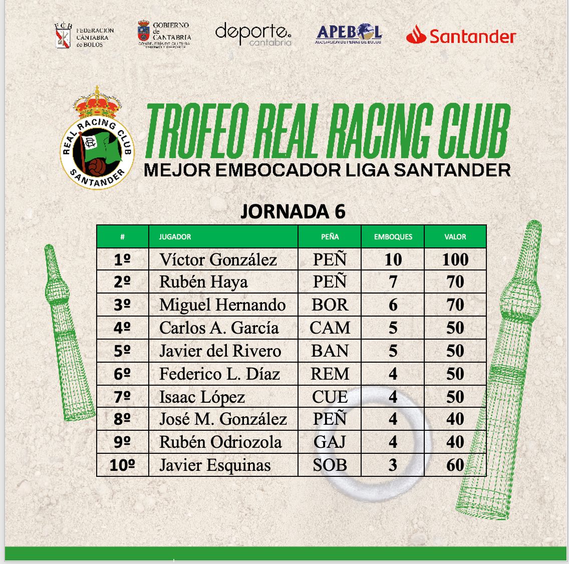 Tras la sexta jornada de la Liga Santander, disputada el pasado fin de semana, Víctor González se mantiene al frente de la clasificación del Trofeo Real Racing Club al Mejor Embocador, superando en tres a su compañero de la Peña Peñacastillo Anievas Mayba Rubén Haya. La tercera plaza es para Miguel Hernando (Hnos. Borbolla Villa de Noja), a cuatro del actual campeón de España. A continuación, en las diez primeras posiciones de la tabla provisional figuran: Carlos García (Camargo), Javier del Rivero (Club Bansander), Federico Díaz (Los Remedios Grupo Teiba), Isaac López (José Cuesta), José Manuel González (Peñacastillo Anievas Mayba), Rubén Odriozola (Gajano Birla Carbón) y Javier Esquinas (Sobarzo).